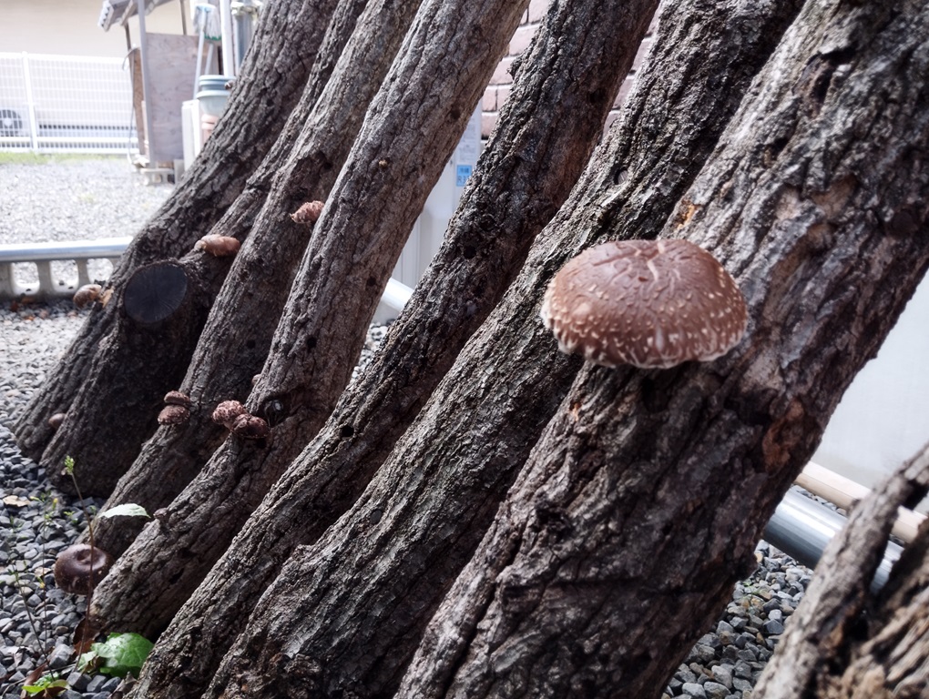 コミュニティハウスしおみとポッポ苑の建物の隙間が山林の環境に似ているということで始めたシイタケ栽培。今年もシイタケが生えてきました。